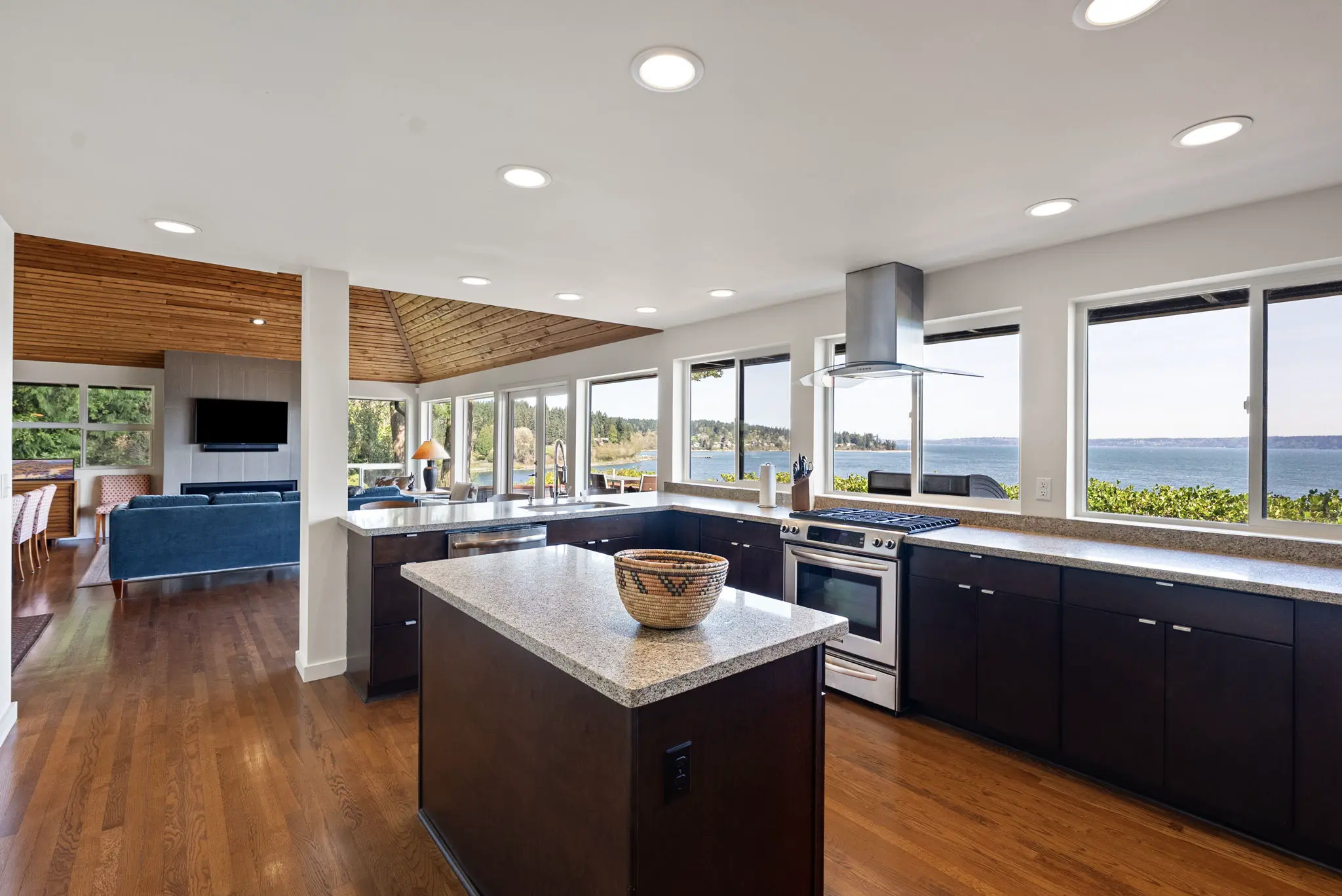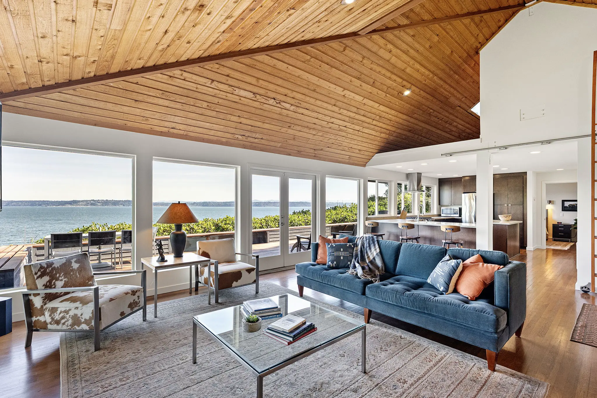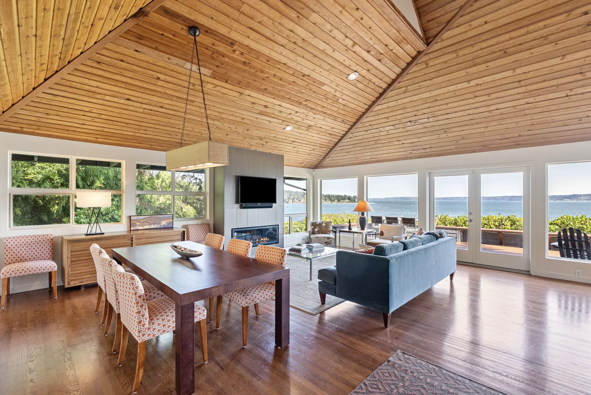 A step-less, covered entry opens to a breathtaking main living space with 18-foot vaulted, cedar-planked ceilings, rich hardwood floors and walls of glass framing the view from every angle. A natural gas fireplace anchors the living room, with French doors opening to an expansive 1,100 square foot view deck—ideal for entertaining large groups.