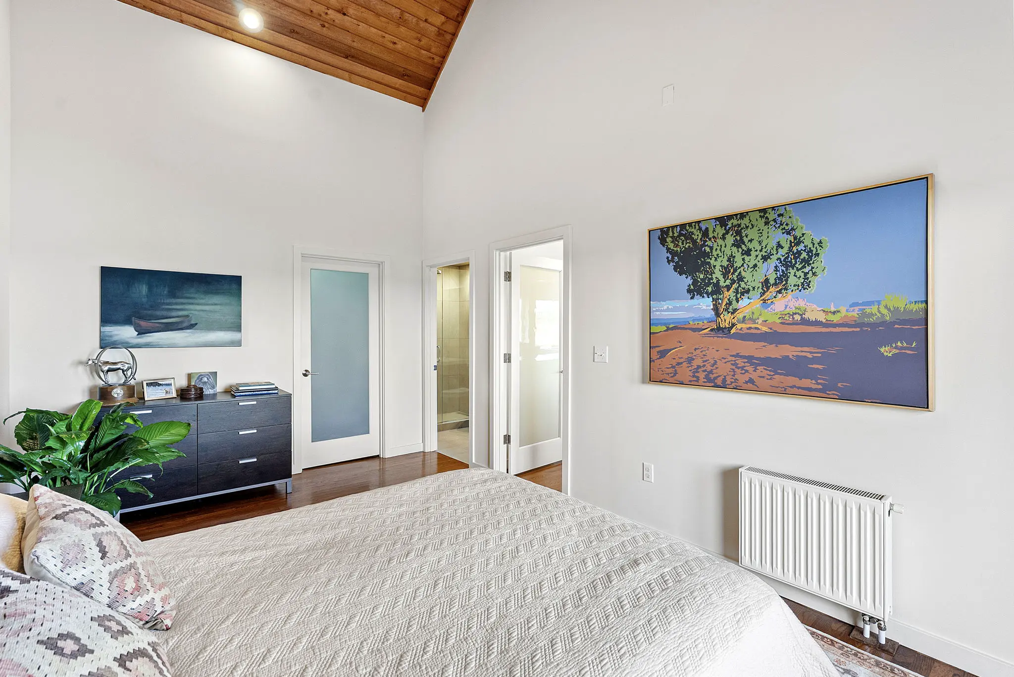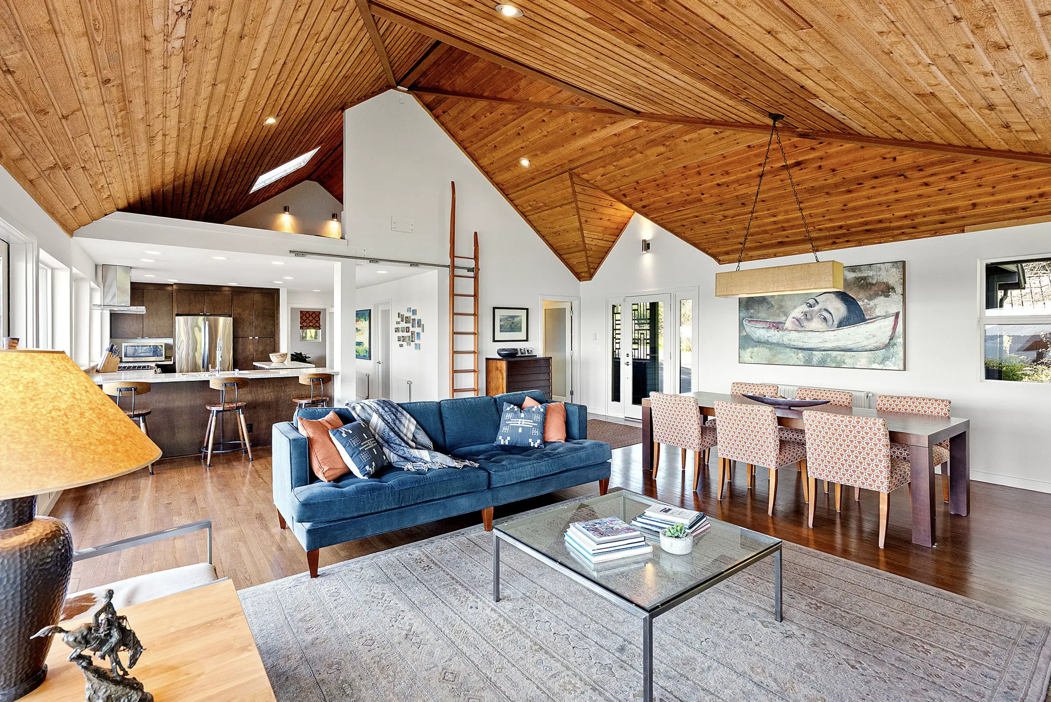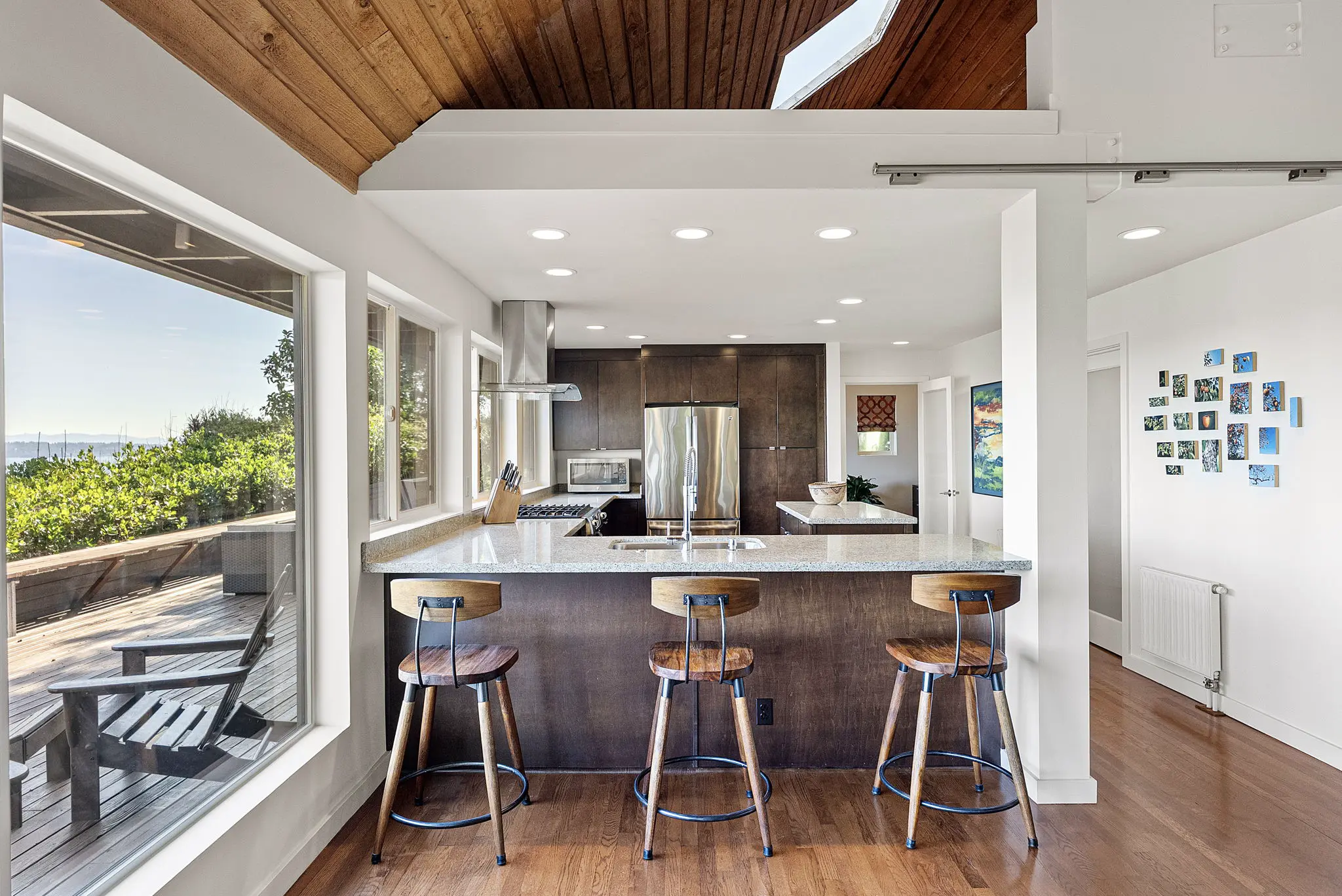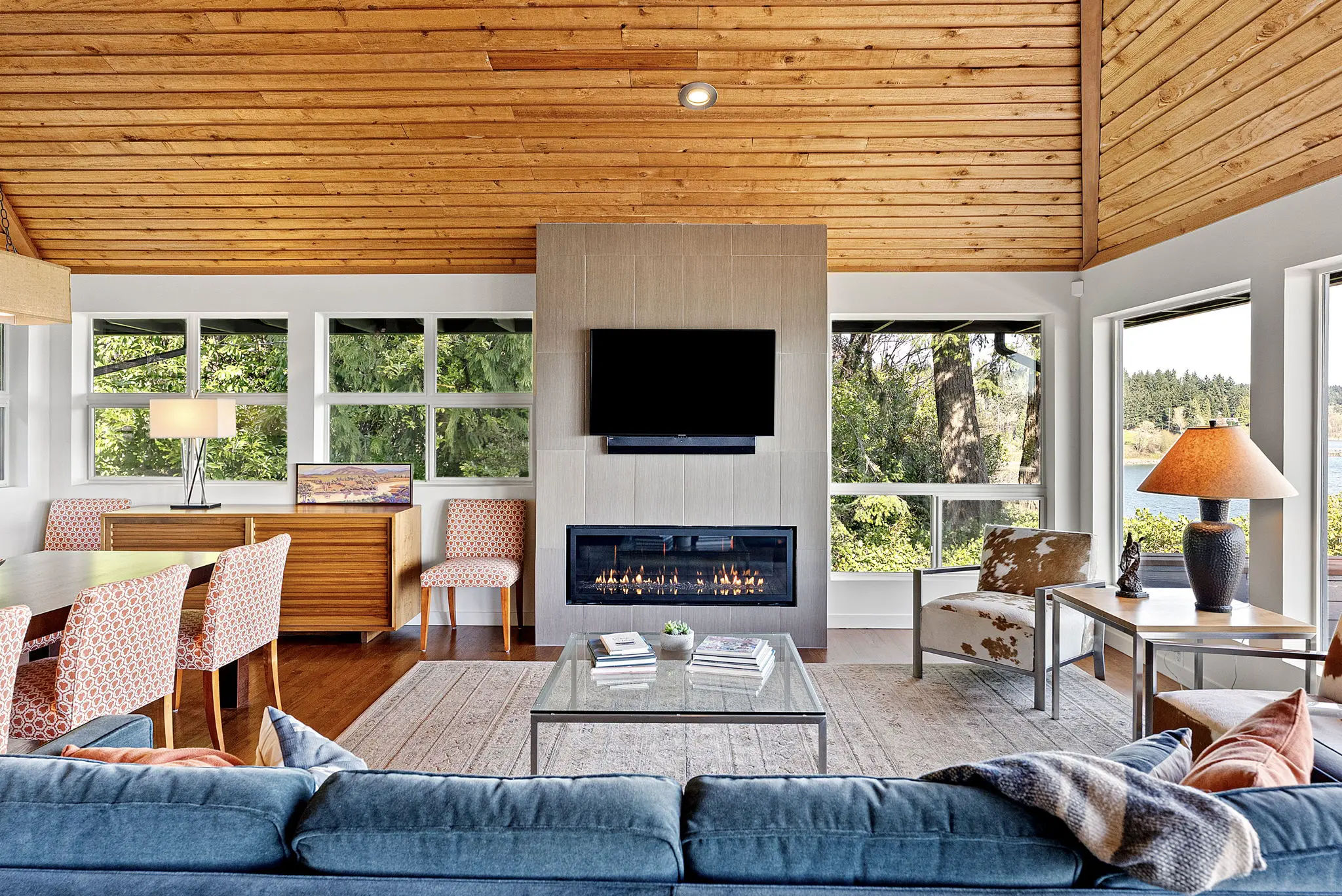 A step-less, covered entry opens to a breathtaking main living space with 18-foot vaulted, cedar-planked ceilings, rich hardwood floors and walls of glass framing the view from every angle. A natural gas fireplace anchors the living room, with French doors opening to an expansive 1,100 square foot view deck—ideal for entertaining large groups.